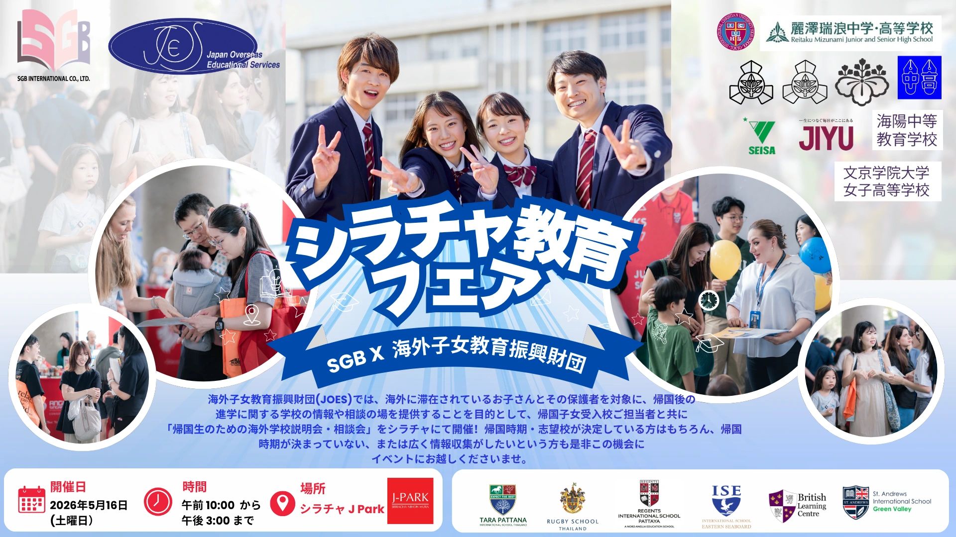 シラチャ教育フェアは、日本とタイをつなぐ架け橋となることを目的とし、シラチャ、パタヤ、チョンブリに在住するご家族や学生の皆さまと、日本の教育機関を結びつける教育イベントです。